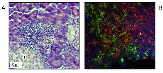 Figure 1: Presence of CD11c+ cells in pancreatic lesions of MRL/MpJ mice. Pancreatic tissue from an adult MRL/MpJ mouse was subjected to histological and immunofluorescence studies. A. H&E staining shows pathological changes typical of AIP, stage 2 (infiltrates of mononuclear cells; beginning destruction of exocrine tissue). Note that the pancreatic islet, indicated by an asterisk, is free of infiltrate. B. Immunofluorescence staining of CD3+ lymphocytes (red) and CD11c+ cells (green) within an inflammatory pancreatic lesion revealed a close spatial proximity of both cell types. Counterstaining was performed employing DAPI (blue) (original magnification 60x).