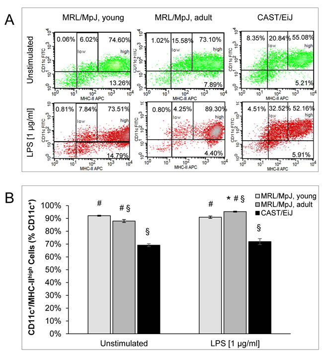 Figure 3: Coexpression of CD11c and MHC-II by BM-derived cDCs. For experimental details, please refer to Figure 2. A. Representative dot plots of flow cytometric analyses are shown for all experimental groups and culture conditions (with and without LPS, respectively). B. CD11c+/MHC-IIhigh cells are indicated as percentage of all CD11c+ cells (= 100 %). Data are presented as mean ± SEM (n ≥ 12 cultures from different mice); *P < 0.05 versus cDCs of the same experimental group cultured without LPS; §P < 0.05 versus identically cultured cDCs of young MRL/MpJ mice; #P < 0.05 versus identically cultured cDCs of CAST/EiJ mice.