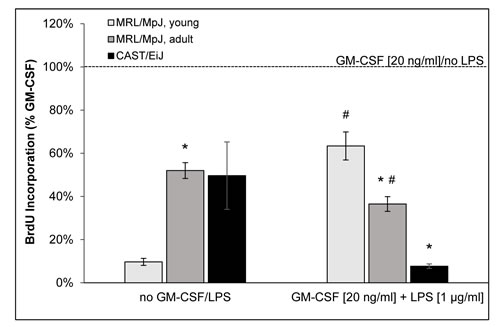 Figure 4: BrdU incorporation of BM-derived cDCs. On day 9 of routine culture, cDCs of young MRL/MpJ mice, adult individuals of the same strain and CAST/EiJ mice were cultured for 24 h with GM-CSF and LPS as indicated. Pretreated cells were labeled with BrdU for another 24 hours and proliferation was assessed with the BrdU DNA incorporation assay. One hundred percent BrdU incorporation corresponds to cDCs of the respective strain that were cultured under standard culture conditions (GM-CSF at 20 ng/ml, no LPS). Data are presented as mean ± SEM (n ≥ 11 cultures from different mice); *P < 0.05 versus identically cultured cDCs of young MRL/MpJ mice; #P < 0.05 versus identically cultured cDCs of CAST/EiJ mice.