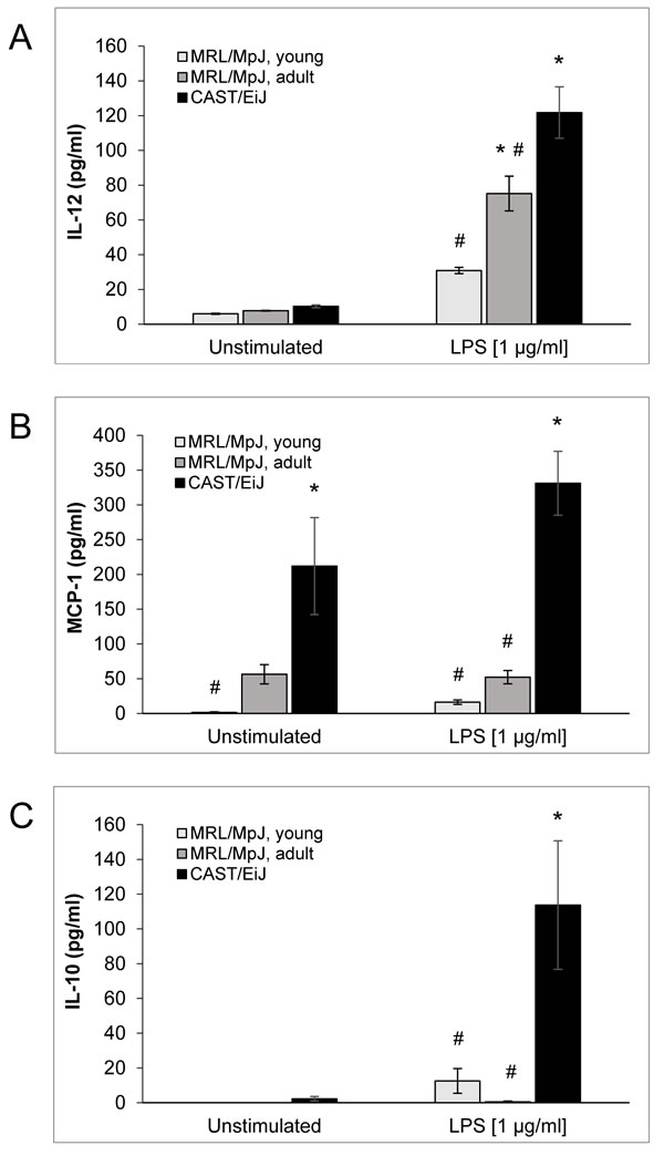 Figure 5: Cytokine levels in cDC culture supernatants. The supernatants of BM-derived cDC cultures from the indicated experimental groups were collected on day 10 after routine culture with GM-CSF alone (unstimulated; left columns) and after 24 h of stimulation with LPS (1 µg/ml; right columns). The levels of A. IL-12 were determined by ELISA, whereas concentrations of B. MCP-1 and C. IL-10 were measured using the LEGENDplex Multi-Analyte Flow Assay Kit. Data are presented as mean ± SEM (n = 6 cultures from different mice for MCP-1 and IL-10; n ≥ 14 for IL-12); *P < 0.05 versus identically cultured cDCs of young MRL/MpJ mice; #P < 0.05 versus identically cultured cDCs of CAST/EiJ mice. There were no significant differences between young and adult MRL/MpJ mice for any cytokine and experimental condition.