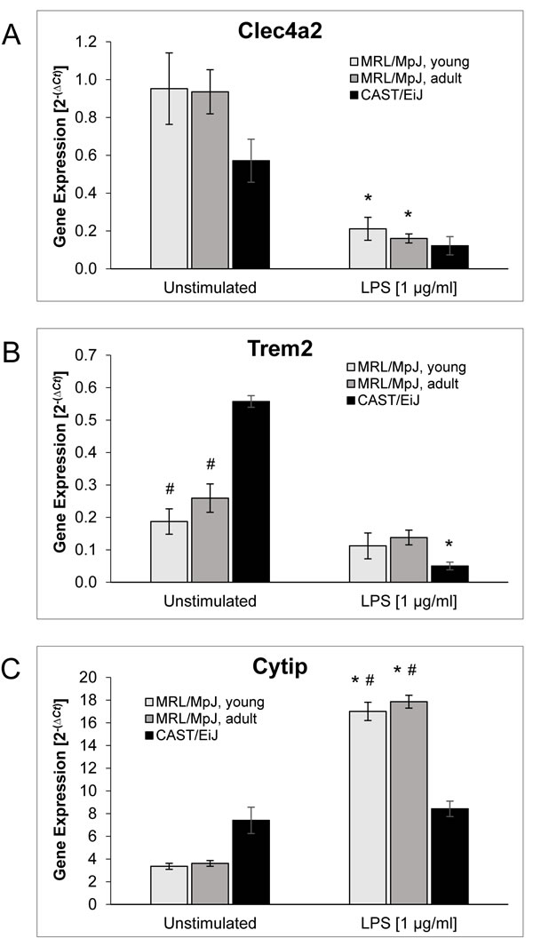Expression of clec4a2 (Figure 6A) did not differ significantly between cDCs of the three mouse cohorts, independent of the presence or absence of LPS. In response to LPS stimulation, clec4a2 mRNA levels dropped significantly in cDCs from young and adult MRL/MpJ mice, but also by trend in cDCs from CAST/EiJ mice.