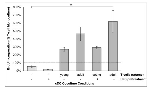 Figure 7: BrdU incorporation of cDC/T-cell cocultures. Irradiated cDCs of young MRL/MpJ mice (pretreated with LPS as indicated) were cocultured with splenic T-cells from young and adult MRL/MpJ mice for 48 h as indicated. Afterwards, the cells were labeled with BrdU for another 24 h and proliferation was assessed with the BrdU DNA incorporation assay. The corresponding monocultures of T-cells from young and adult MRL/MpJ mice were set as one hundred percent. For monocultures of DCs (columns 1 and 2), all T-cell monocultures together were used as reference (100%). Data are presented as mean ± SEM (n ≥ 6 separate cultures); *P < 0.05 versus corresponding monocultures of T-cells.