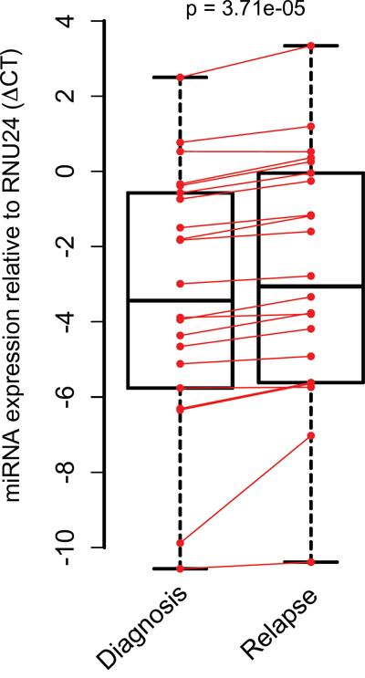 Difference between mRNA and miRNA expression levels between paired initial diagnosis-relapse samples, as measured by Taqman, were determined using the one-sided Wilcoxon paired signed rank test.