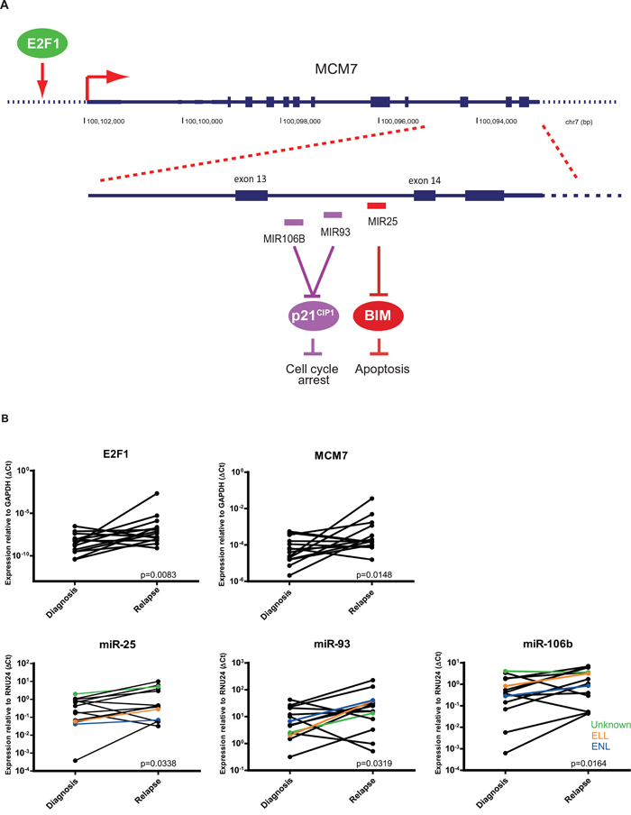 Figure 3: Relative expression of E2F1, MCM7, and miR-106b~25 cluster. A. The miR-106b~25 cluster in located intron 13-14 of MCM7 and cotranscribed together as part of the MCM7 primery RNA transcript. E2F1 regulates MCM7 expression. B. Relative miRNA expression of miR-25, miR-93, and miR-106b in 14 paired initial diagnosis-relapse pediatric AML samples with MLL-rearrangements and mRNA expression of E2F1 and MCM7. Patients without AF9 or AF10 translocation have comparable miR-106b~25 expression (colored lines). Data are presented with one-sided p-values.