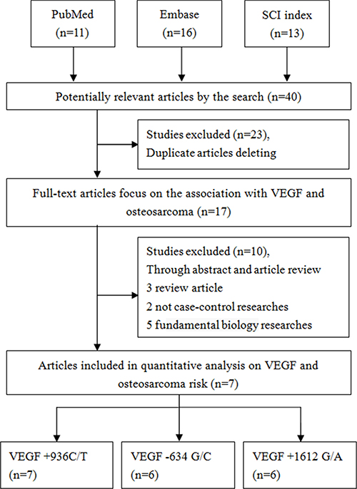 Three online electronic databases (PubMed, Embase, and Science Citation Index) were searched with the following terms: (“osteosarcoma”) AND (“vascular endothelial growth factor” OR “VEGF”) AND (“polymorphism” OR “SNP” OR “single nucleotide polymorphism” OR “variant”), from inception to January 2016. Furthermore, all the references of the collected studies were examined so that additional relevant studies could be identified. Only English language full-text case-controls studies were included.