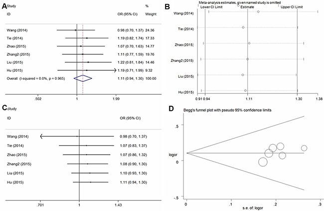 Figure 2: Statistical analysis of the association between the VEGF +936C/T polymorphism and osteosarcoma risk in the CT + TT vs. CC model. (A) ORs and 95% CIs; (B) sensitivity analysis; (C) cumulative analysis; (D) publication bias.