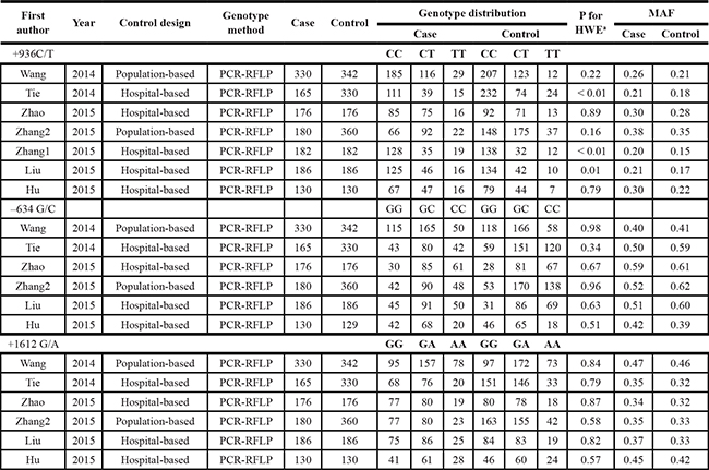 Table 1: Characteristics of case-control studies on VEGF polymorphisms and osteosarcoma risk included in the meta-analysis
