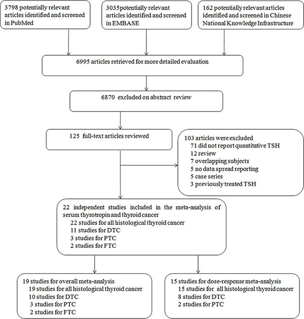 We conducted a systematic literature search using the PUBMED, EMBASE and Chinese National Knowledge Infrastructure databases to April 21, 2016. The search strategy in these databases all comprised MeSH terms of “thyroid neoplasm” or “thyroid cancer,” as well as (all fields) “thyrotropic hormone,” “thyrotropin,” “TSH,” and “hormothyrin,” following the MOOSE (Meta-analyses Of Observational Studies) guidelines [20]. No language restriction was applied. We also hand searched reference lists from eligible papers as well as reference lists from national and international thyroid cancer and nodule guidelines [31–35].