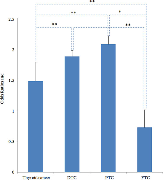 Figure 3: OR comparison between all histological thyroid cancer (thyroid cancer), differentiated thyroid carcinoma (DTC), papillary thyroid carcinoma (PTC) and follicular thyroid carcinoma (FTC). *P < 0.05, **P < 0.01.