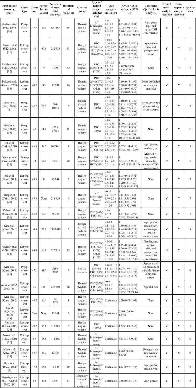 Of 6995 articles obtained on a literature search, 125 papers passed the screening phase with the full-text articles reviewed (Figure 1). This yielded a final total of 22 studies [1, 7, 10–29] being combined in meta-analysis (53,538 participants). The most common reasons for study rejection included: studies did not report quantitative TSH (n = 71), the articles were reviews (n = 12) or overlapping subjects (n = 7). The duration of follow-up ranged from 1 to 20 years. Among these studies, 22 studies [1, 7, 10–29] for overall thyroid cancer, 10 studies [1, 8, 15, 17, 19, 21, 22, 24, 28, 29] for differentiated thyroid carcinoma, 3 studies [1, 15, 28] for papillary thyroid carcinoma, and 2 studies [19, 24] for follicular thyroid carcinoma. Main characteristics of the studies are shown in Table 1. Newcastle-Ottawa Scale (NOS) was analyzed for quality assessment and all these included studies were above 6 stars (Supplementary Table S1).
