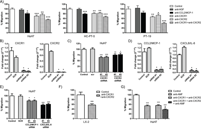 Figure 2: CXCL8/IL-8, CXCL1-2-3/GRO and CCL2/MCP-1 axes are important for MSC in vitro migration. A. In vitro chemotaxis assay of MSCs towards CM derived from HuH7 (left panel), HC-PT-5 (middle panel) or PT-19 (right panel). Pre-treatment with neutralizing antibodies to inhibit HGF or CCL2/MCP-1 was performed in each CM, while inhibition of CXCR1, CXCR2 or CXCR1 + CXCR2 was performed in MSCs. Results are expressed as percentage of control (isotype control IgG) ± SEM. *p<0.05, **p<0.01 and ***p<0.001 vs control (ANOVA and Dunnett’s test). B. qRT-PCR analysis of CXCR1 or CXCR2 expression in MSCs 72 h after transduction with 2 different specific shRNAs retrovirus. Untransduced MSCs (control) and scrambled negative control (SCR) were used. *p<0.05 vs control and SCR (Kruskal-Wallis test). C. In vitro chemotaxis assay of CXCR1 or CXCR2 depleted MSCs towards CM derived from HuH7. Results are expressed as percentage of control (untransduced MSCs) ± SEM. *p<0.05, **p<0.01 and ***p<0.001 vs control and SCR (ANOVA and Dunnett’s test). D. qRT-PCR analysis of CCL2/MCP-1 or CXCL8/IL-8 expression in HuH7 72 h after transfection with specific siRNAs. Untransfected HuH7 and scrambled negative control (SCR) were used. *p<0.05 vs control and SCR (Kruskal-Wallis test). E. In vitro chemotaxis assay of MSCs towards CM derived from monolayer of CCL2/MCP-1 or CXCL8/IL-8 depleted HuH7 cells. Results are expressed as percentage of control (untransfected MSCs) ± SEM. *p<0.05 and ***p<0.001 vs control and SCR (ANOVA and Dunnett’s test). F. In vitro chemotaxis assay of MSCs towards CM derived from LX-2 cells. Pre-treatment with neutralizing antibodies to inhibit CXCR1 + CXCR2 was performed in MSCs. Results are expressed as percentage of control (isotype control IgG) ± SEM. ***p<0.001 vs control (t-test). G. In vitro chemotaxis assay of MSCs towards CM derived from HuH7. Pre-treatment with neutralizing antibody to inhibit AMF was performed in the CM, while antibody inhibition of CXCR1 + CXCR2 was performed in MSCs. Results are expressed as percentage of control (isotype control IgG) ± SEM. ***p<0.001 vs control; Фp<0.05 vs anti-AMF and anti-CXCR1+anti-CXCR2 (ANOVA and Dunnett’s test). All of the above data represent the average of 3 independent experiments, each performed in quadruplicate.