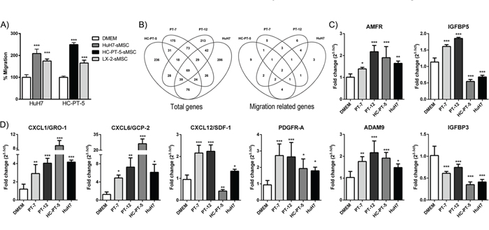 Figure 3: HCC CM enhanced MSC migratory capacity and induced changes in their gene expression pattern. A. Stimulation of MSCs with CM of HuH7 (dark grey bar), HC-PT-5 (black bar) or LX-2 (grey bar) increases chemotaxis towards CM derived from HuH7 or HC-PT-5 cells compared to unstimulated MSCs (DMEM, white bars). Results are expressed as percentage of control (DMEM) ± SEM of 3 independent experiments, each performed in quadruplicate. ***p<0.001 vs unstimulated cells (DMEM, ANOVA and Tukey’s comparison test). B. Venn diagram showing overlap of all the transcripts (left panel) or the genes related with cell migration and invasion (right panel) modulated in MSCs after the exposure to the different CM (HC-PT-5, PT-7, PT-12 or HuH7). C-D. q-RT-PCR validation of certain genes related with cell migration and invasion in MSCs stimulated with the CM (PT-7, PT-12, HC-PT-5 or HuH7) or unstimulated MSCs (DMEM). *p<0.05, **p<0.01 and ***p<0.001 vs unstimulated MSCs (DMEM, ANOVA Dunnett’s test).