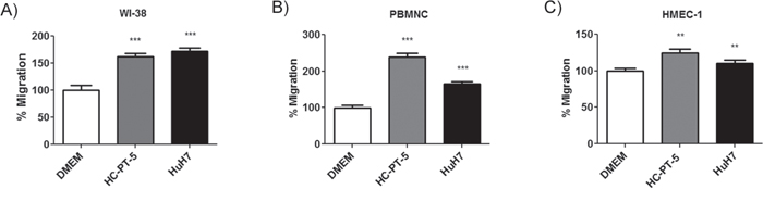 Figure 4: HCC CM-stimulated MSCs modulated migratory capacity of components of tumor microenvironment. Chemotaxis assay of fibroblasts A., peripheral blood mononuclear cells B., or endothelial cells C., towards CM of stimulated MSCs with HC-PT-5 (grey bars), with HuH7 (black bars) or unstimulated MSCs (DMEM, white bars). Results are expressed as percentage of control (DMEM) ± SEM of three independent experiments, each performed in quadruplicate. **p<0.01 and ***p<0.001 vs unstimulated MSCs (DMEM, ANOVA and Dunn’s post test).