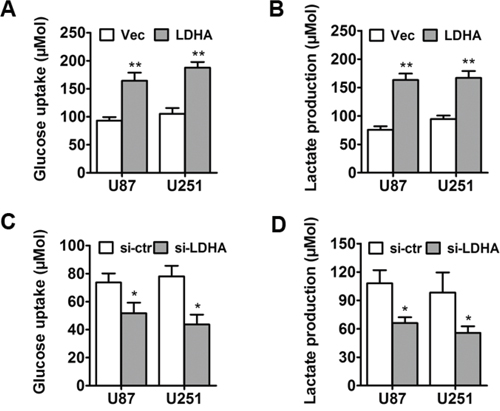 LDHA-expressing vector, si-LDHA or respective control vector was transfected into glioma cell lines U87 and U251. Cell culture media were collected 48 hours after the transfection. Glucose uptake and lactate production were measured using Amplex® Red Glucose/Glucose Oxidase Assay Kit (Invitrogen, USA) and lactate assay kit (Sigma, USA) respectively. The results were normalized on the basis of total cellular protein amounts.