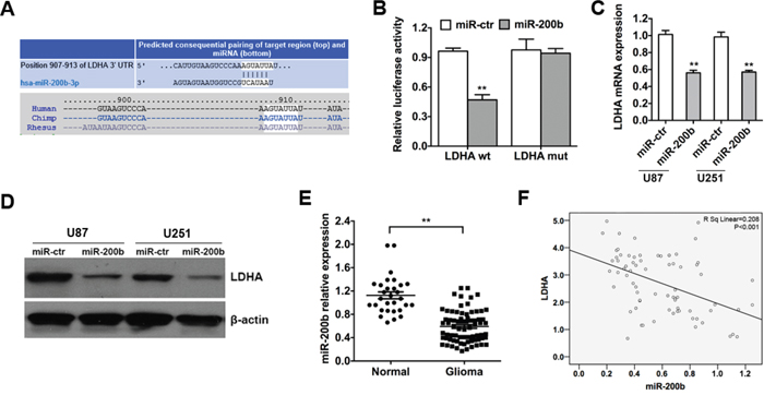 Figure 3: LDHA is a direct target of miR-200b and is negatively correlated with miR-200b in glioma. A. The predicted binding site of miR-200b on LDHA mRNA is shown. B. Luciferase assay on U251 cells co-transfected with miR-200b mimics or scramble control and a luciferase reporter containing the full length of LDHA 3’-UTR (LDHA-wt) or a mutant (LDHA-mut) in which the first five nucleotides of the miR-200b binding site were mutated. An empty luciferase reporter construct was used as a negative control. Luciferase activities were measured 48 hours post-transfection. miR-200b markedly suppressed luciferase activity in LDHA-wt reporter constructs. C. U87 and U251 cells were transfected with miR-200b mimics or scramble control, and the level of LDHA mRNA was evaluated by qRT-PCR. β-actin mRNA was used as an endogenous normalizer. D. After the tramsfection, the level of LDHA protein was measured by western blot. β-actin was used as an endogenous normalizer. E. The expression levels of miR-200b in 73 glioma samples and 30 unmatched normal cerebrum samples were assessed using qRT-PCR. U6 snRNA was used as an endogenous control. F. qRT-PCR showed that mRNA levels of LDHA were inversely related to the expression of miR-200b in 73 glioma samples. All of the data are shown as the means ± s.e.m. ** P < 0.01.