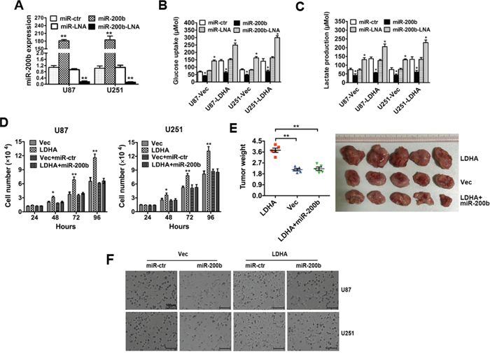 Figure 4: LDHA-induced glycolysis, cell proliferation and invasion can be inhibited by miR-200b. A. U87 and U251 cells were transfected with miR-200b mimics, miR-200b-LNA or respective control. The alteration of miR-200b was confirmed by qRT-PCR B. U87 and U251 cells were transfected with control vector or LDHA-expression vector followed by miR-200b mimics, miR-200b-LNA or respective control. After transfection the level of glucose uptake was measured. C. U87 and U251 cells were transfected as described before. The level of lactate production was measured after transfection. D. U87 and U251 cells were transfected with control vector, LDHA-expression vector, control vector + scrambled control or LDHA-expression vector + miR-200b mimics respectively. The number of cells was counted. E. U87 and U251 cells transfected with LDHA-expression vector, control vector or LDHA-expression vector + miR-200b mimics were injected subcutaneously into nude mice (five in each group). After 28 days, the mice were sacrificed, and necropsies were performed. Then the tumors were weighed. F. U87 and U251 cells were transfected with control vector or LDHA-expressing vector followed by scramble control or miR200b mimics. Cell invasion capacity was assessed by transwell assay. All of the data are shown as the means ± s.e.m. * P < 0.05, ** P < 0.01.