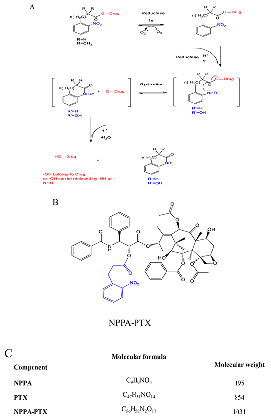 Figure 1: Proposed activation mechanism of nitrophenylalkanoic acid bioreductive prodrugs under convertible reduction. (A). Structures and molecular formulas of NPPA-PTX (B and C).