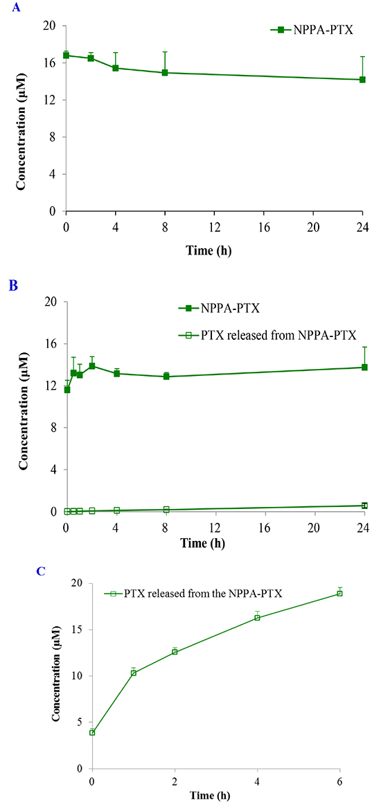 Because the ester linkage in the NPPA-PTX molecule might be susceptible to hydrolysis, the stability of NPPA-PTX is an important issue. The in vitro stability of NPPA-PTX was investigated in PBS and rat plasma. Our results indicated that NPPA-PTX was stable in PBS solution for at least 24 hours without dissociation of PTX from the NPPA-PTX, as shown in Figure 2A. Our results also indicated that NPPA-PTX was also stable in rat plasma at least 24 hours with less than 4.2 % dissociated PTX (Figure 2B). The enzymolysis of NPPA-PTX was evaluated in vitro. As shown in Figure 2C, we found the dissociated PTX released from NPPA-PTX.