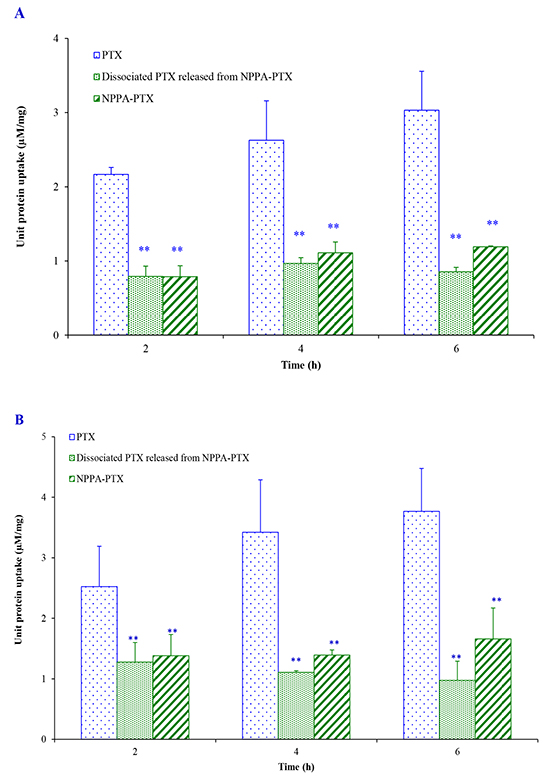 Figure 4: Cell uptake efficiency following culture with PTX and NPPA-PTX for 2, 4, 6 h in KB cells. (A) and MDA-MB-231 cells (B). ** p<0.01, compared with PTX group.