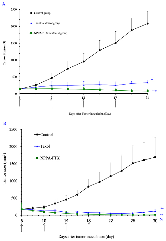 Figure 6: In vivo anti-tumor activity of NPPA-PTX in KB (A) and MDA-MB-231 (B) tumor-bearing nude mice. KB cells were implanted in the nude mice on the 0 day, and the treatment was started on the 5th day when the tumor volume reached about 100-200 mm3. The treatment involved administration of saline solution, Taxol and NPPA-PTX on the 5th, 9th, 13rd and 17th day, respectively. Data are presented as the mean ± SD per group measured at indicated days after treatment (n=6). MDA-MB-231 cells were implanted in the nude mice on the 0 day, and the treatment was started on the 6th day when the tumor volume reached about 100-200 mm3. The treatment involved administration of saline solution, Taxol and NPPA-PTX on the 6th, 10th, 14th and 18th day, respectively. Data are presented as the mean ± SD per group measured at indicated days after treatment (n=6). ** p<0.01, compared with the control group; $$ p<0.01, compared with the Taxol treatment group.