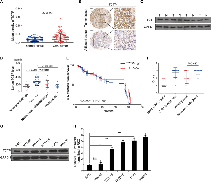 Figure 1: TCTP is a potential biomarker of CRC. A. The expression levels of TCTP in 134 paired tumor tissues and adjacent tissues were detected by immunohistochemistry (IHC). B. Representative IHC images of TCTP expression in paired tumor and adjacent tissues. C. Western blot analysis of TCTP expression in four paired tumor and adjacent tissues. GAPDH served as a loading control. D. Bar graph showing TCTP expression in the serum of 93 CRC patients measured by ELISA. P value was calculated by One-Way ANOVA. E. Kaplan–Meier analysis of metastasis-free survival of 90 CRC patients, as a comparison of tumors expressing high TCTP versus low TCTP. P=0.0061 by long rank test. F. TCTP IHC staining score of normal individuals, colonic adenoma, primary sites, and metastasis sites. P=0.037 by Mann–Whitney U test. G. Western blot analysis of endogenous TCTP expression in six CRC cell lines. GAPDH served as a loading control. H. Relative TCTP mRNA levels (normalized to TCTP mRNA level in RKO) in six CRC cell lines. ***P<0.001 by One-Way ANOVA. NS: no significance.
