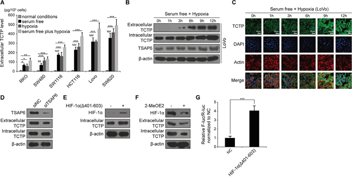 Figure 2: TCTP is secreted under low serum and hypoxic conditions. A. Extracellular TCTP secreted from different medium-conditioned CRC cell lines was measured by ELISA. *P<0.05, **P<0.01, ***P<0.001 by One-Way ANOVA. B. Western blot analysis of the expression levels of extracellular TCTP, intracellular TCTP, and TSAP6 in LoVo cells under serum free plus hypoxic conditions. C. Expression of intracellular TCTP under serum free and hypoxic conditions at the indicated time points was observed under a confocal microscope. Representative photographs are shown. TCTP, FITC dye (green); F-actin, Rhodamine B dye (red); nuclear, DAPI dye (blue). Scale bar: 40 μm. D. Expression and secretion of TCTP mediated by silencing of TSAP6 under serum free plus hypoxic conditions. E. HIF-1α (Δ401-603) promotes TCTP expression under normal conditions. F. 2-MeOE2 inhibits TCTP expression and secretion under serum free plus hypoxic conditions. G. Relative luciferase activity was measured by transfection of either pENTER, pGL6-pTCTP-luc and pRLTK or pENTER-HIF-1α (Δ401-603), pGL6-pTCTP-luc and pRLTK for 24h under normal conditions. F-luc: Firefly luciferase. R-luc: Renilla luciferase. NC: negative control.