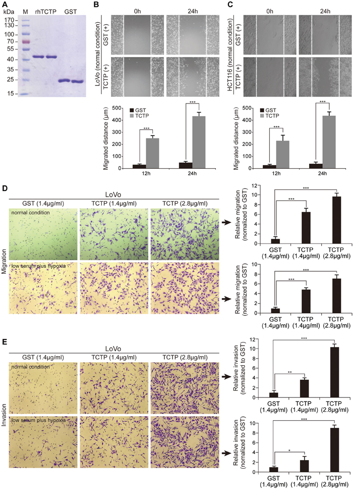 The role of rhTCTP in the migratory ability of LoVo and HCT116 cells was determined using a wound-healing assay. Cells were seeded on 6-well plates and a wound was scratched in the cell lawn with a 200-μL pipette tip. The cells were washed with PBS three times to remove debris. Purified rhTCTP was added at a final concentration of 2.8μg/mL and images of wound closure were captured every 4 h for 24 h. All experiments were performed in triplicate.
