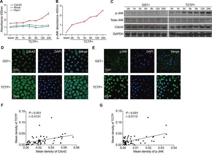 For immunohistochemical assays, tissue samples were dissected, fixed in 4% paraformaldehyde, and sliced into 4-mm paraffin-embedded pieces. After dewaxing, nonspecific peroxidase activity was blocked with 3% H2O2 for 15 min, followed by washing three times with PBS for 5 min per wash. Sections were then incubated in 5% BSA-PBS for 30 min, followed by probing with the respective primary antibodies (1:200 dilution for TCTP staining, 1:100 dilution for Cdc42, and 1:100 dilution for p-JNK) at 4°C overnight. Immunostaining continued with HRP-conjugated secondary antibodies for 4h at room temperature. Hematoxylin was then applied for nuclear counterstaining.