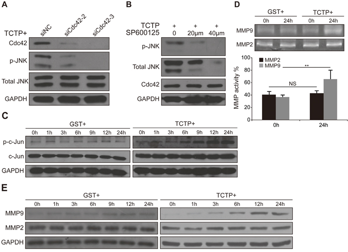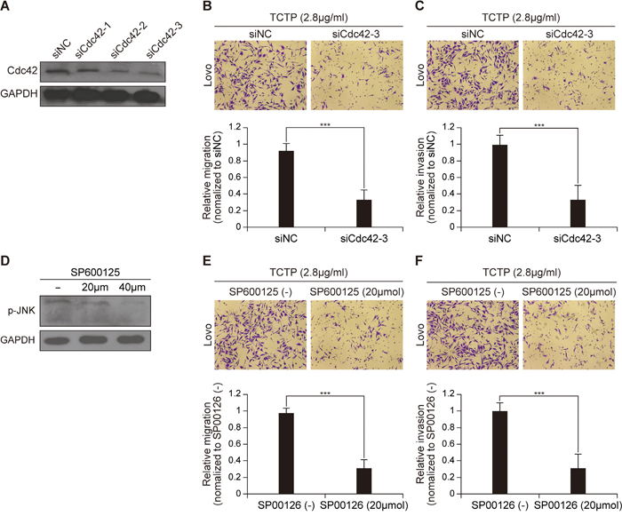 The effects of GST, rhTCTP, siRNA, and JNK inhibitor on cell migration were measured using a 6.5-mm Transwell plate (Cat. 3422. Corning, NY, USA) with a 0.4-μm pore polyester membrane insert in a 24-well plate. Briefly, cells were grown under starvation conditions (RPMI1640+1%FBS) overnight. After trypsinization, cells were resuspended at a density of 1.5×106/mL in DMEM supplemented with 1% FBS and a volume of 200μL was transferred to the upper chamber of the Transwell plate. The lower chamber was filled with DMEM containing 1% FBS and a gradient concentration of rhTCTP or GST. After 14h of incubation, cells were immobilized with 100% methanol for 10 min and stained with 0.1% crystal violet for 15 min. The non-migrating cells were removed with a cotton swab. For cell invasion assays, the experimental procedures were similar to those of the cell migration assay with two notable modifications. First, an invasion chamber 24-well plate (Cat. 354480. BD Biosciences, Franklin Lakes, USA) was used instead of the 6.5-mm Transwell plate. Secondly, the incubation time was prolonged to 20h for LoVo cells and to 24h for HCT1116 cells. For both assays, migrated cells were counted in six randomly selected fields under a microscope at a magnification of 400×. All assays were performed in triplicate.