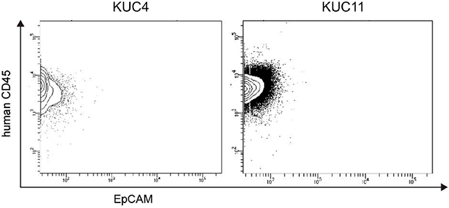 Histological examination showed that 7 of 9 (78%) PDX tumors recapitulated histopathological characteristics of the patient CRC tissues (Supplementary Figure S1). But 2 PDXs (KUC4 and KUC11) did not resemble the parent CRC tissues but exhibited the morphological characteristics of lymphoma (Figure 1). Hematoxylin and eosin (H.E.) staining showed that both lymphoma tissues were composed of large atypical lymphoid cells arranged in a diffuse fashion, against the background of scattered small non-dysplastic lymphocytes. On immunostaining and in situ hybridization, the neoplastic cells were diffusely positive for a B cell marker CD20 and EBER, but negative for a T cell marker CD3 (Figure 1B). These morphological features were consistent with diffuse large B-cell lymphoma (DLBCL). Histology review of the patient CRC tissues revealed occasional small lymphoid aggregates consisting of mixed CD3-positive T lymphocytes and CD20-positive B lymphocytes, but neither dysplastic lymphocytes nor EBER-positive cells were found (Figure 1A). Flow cytometric analyses of KUC4 and KUC11 DLBCL PDXs showed that tumor cells within the PDXs were predominantly positive for human CD45 and negative for human EpCAM (Figure 2), confirming that these tumors originated from human lymphocytes presented in the surgical specimens.