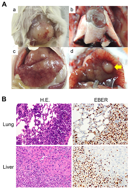 Figure 3: Formation of the DLBCL PDX and its distant metastases. A. Macroscopic views of the DLBCL PDX tumor and its metastatic organs (a. DLBCL PDX tumor, b. lung, c and d. liver). No tumor mass was grossly apparent in the lungs, while a large nodular metastasis was observed in the liver (yellow arrow). B. Diffuse infiltration of lymphoma cells in the lung and liver. H.E. (left panels) and EBER ISH (right panels) are shown (original magnification, ×100 for the lung, x200 for the liver). The infiltrated lymphocytes were strongly positive for EBER ISH (brown).