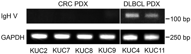 Then, we performed the clonality analyses of the lymphocytes by immunoglobulin heavy chain (IgH) gene rearrangement assay. The unique dominant rearrangements that correspond to clonal B-cell proliferation, were detectable in the DLBCL PDXs, but not in the CRC PDXs (Figure 4), consistent with the notion that DLBCL is induced by the clonal expansion of the human B lymphocytes.
