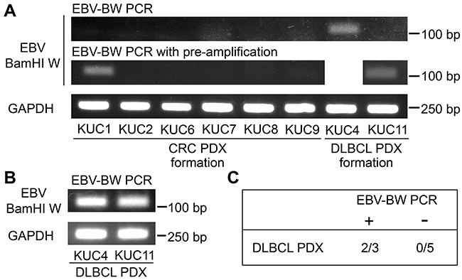 Figure 5: Amplification of EBV BamHI W region in the patient CRC specimens. A. RT-PCR analyses of the EBV BamHI W region in the patient CRC specimens which gave rise to the CRC or DLBCL PDXs. The amplification of BamHI W region was detected in 1 of 8 patient CRC specimens (KUC4) by EBV-BW PCR, and became detectable in 2 of 7 patient CRC specimens (KUC1 and KUC11) after the pre-amplification of templates (p-EBV-BW PCR). GAPDH was amplified as an internal control. B. RT-PCR analyses of the EBV BamHI W region in the DLBCL PDXs. BamHI W region was amplified by EBV-BW PCR. GAPDH was amplified as an internal control. C. Incidence of lymphomagenesis by the xenotransplantation of the patient CRC specimens positive or negative for EBV-BW PCR. Lymphomagenesis was observed in 2 of 3 EBV-BW PCR/p-EBV-BW PCR positive CRC specimens.