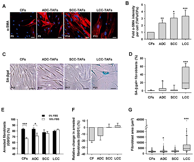 Lung TAFs exhibit a myofibroblast-like phenotype regardless of their histological subtype, whereas senescence is restricted to LCC-TAFs