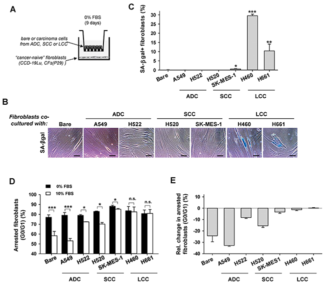 Figure 2: Analysis of senescence markers in normal (cancer-naive) lung fibroblasts co-cultured with lung cancer cell lines derived from ADC, SCC and LCC patients. A. Outline of the Transwell-based co-cultures. B. Representative phase contrast images of SA-βgal stainings of CCD-19Lu fibroblasts co-cultured with a panel of lung cancer cell lines. More images are shown in Supplementary Figure S2. C. Average percentage of SA-βgal+ CCD-19Lu fibroblasts co-cultured with a panel of lung cancer cell lines. Bare Transwell inserts were used as negative control. All pair-wise comparisons were performed with respect to Bare. D. Average percentage of growth arrested CCD-19Lu fibroblasts co-cultured with a panel of lung cancer cell lines with 0% or 10% FBS. E. Average relative changes in growth arrested cells computed from data in (D) as in Figure 1G.