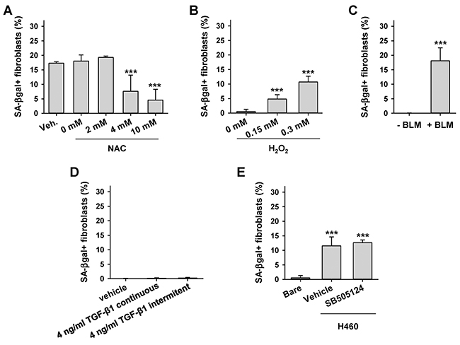 Figure 3: Effect of oxidative stress and exogenous TGF-β1 on fibroblast senescence induction by LCC cells. A. Average percentage of SA-βgal+ CCD-19Lu fibroblasts co-cultured with H460 in the presence of increasing doses of the antioxidant NAC or vehicle. B, C. Average percentage of SA-βgal+ CCD-19Lu fibroblasts in response to direct or indirect oxidative stress elicited by (B) 2h treatment of H2O2 followed by 4 days of recovery or (C) 9 day treatment with bleomycin (BLM). D. Average percentage of SA-βgal+ CCD-19Lu fibroblasts daily treated with TGF-β1-continuously or intermitently for 4h/day as in [8]- for 2 weeks. E. Average percentage of SA-βgal+ CCD-19Lu fibroblasts co-cultured with H460 in the presence 5 μM of the TGF-β pathway inhibitor SB505124 for 9 days. All results correspond to two replicates from at least three independent experiments. All pair-wise comparisons were performed with respect to Bare or vehicle.