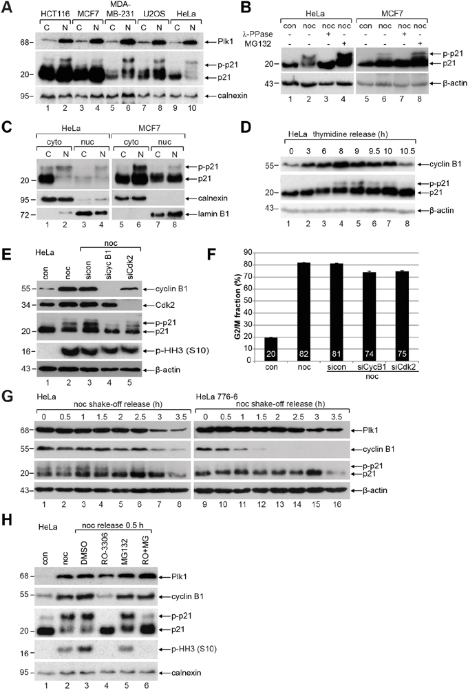 Figure 1: p21 is phosphorylated during mitosis in diverse cancer cell lines. A. HCT116, MCF7, MDA-MB-231, U2OS and HeLa cells were untreated (C) or synchronized to prometaphase with nocodazole (N) for Western blot analyses with indicated antibodies (p-p21: phosphorylated p21). Calnexin served as loading control. B. HeLa and MCF7 cells were untreated (con), treated with nocodazole (noc) or nocodazole combined with λ-phosphatase (λ-PPase) for Western blot analysis. Nocodazole treated cells were further incubated with the proteasome inhibitor MG132 as positive control. β-actin served as Western blot loading control. C. Cytoplasmic (cyto) and nuclear extracts (nuc) were prepared from untreated (C) or nocodazole (N) treated HeLa and MCF7 cells. Calnexin and lamin B1 served as cytoplasmic and nuclear marker, respectively. D. HeLa cells were synchronized with a double thymidine block and released in fresh medium for indicated time points. β-actin served as loading control. E. HeLa cells transfected with control siRNA (sicon), siRNAs targeting cyclin B1 (sicyc B1) or Cdk2 (siCdk2) were synchronized to prometaphase with nocodazole (noc) for Western blot analysis. Untreated (con) and nocodazole treated cells (noc) without transfection served as controls. β-actin was the loading control. F. Cell cycle distribution was analyzed by FACS. The G2/M peak was quantified and results of the duplicates are shown as mean ± SD. G. HeLa cells or stable HeLa 776-6 cells expressing shRNA targeting human cyclin B1 were synchronized with nocodazole (noc). Shake-off cells were released into fresh medium and harvested at indicated time points for Western blot analyses with indicated antibodies. β-actin served as loading control. H. HeLa cells were synchronized to prometaphase with nocodazole and released for 0.5 h into fresh medium containing DMSO, 6 μM RO-3306 (RO), 10 μM MG-132 (MG) or both inhibitors. Untreated (con) and nocodazole (noc) treated cells served as controls. Calnexin was the loading control.