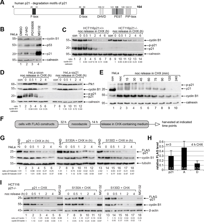 Figure 3: Endogenous phosphorylated p21 and p21S130D are less stable. A. Schematic illustration of human p21 including its different known destruction motifs (gray boxes) like F-box, D-box, caspase cleavage site (DHVD), PEST sequence and PIP-box. B. HeLa cells were treated overnight with the pan-caspase inhibitor Z-VAD, the calpain inhibitor PD150606 and the proteasome inhibitor MG132 for Western blot analyses with indicated antibodies. DMSO served as vehicle and calnexin as loading control. C. HCT116 p21+/+ and p21-/- cells were synchronized to prometaphase with nocodazole (noc), released into CHX-containing medium for indicated time and harvested for Western blot analysis. Calnexin served as loading control. Ratio of cyclin B1/calnexin is shown. D. HeLa cells transfected with control siRNA (sicon) or siRNA against p21 (sip21) were synchronized to prometaphase with nocodazole (noc). The cells were released into CHX-containing medium. Calnexin served as loading control. Ratio of cyclin B1/calnexin is shown. E. HeLa cells were synchronized to prometaphase with nocodazole (noc), released into medium containing CHX for indicated time points for Western blot analysis. Non-treated or nocodazole treated cells were taken as controls. Calnexin served as loading control. F. Working schedule of the CHX kinetics. G. HeLa cells were transfected with different p21-constructs, synchronized with nocodazole and released in CHX-containing medium. Cells treated with the pan-caspase inhibitor Z-VAD were taken as control. Tubulin served as loading control. H. Quantification of the FLAG level normalized against the loading control is shown as mean ± SEM from three independent experiments. Time point: 4 h after CHX treatment. I. CHX release kinetics was also performed with HCT116 p21-/- cells expressing FLAG-p21, S130A or S130D. MG132 treated cells served as positive and β-actin as loading control.