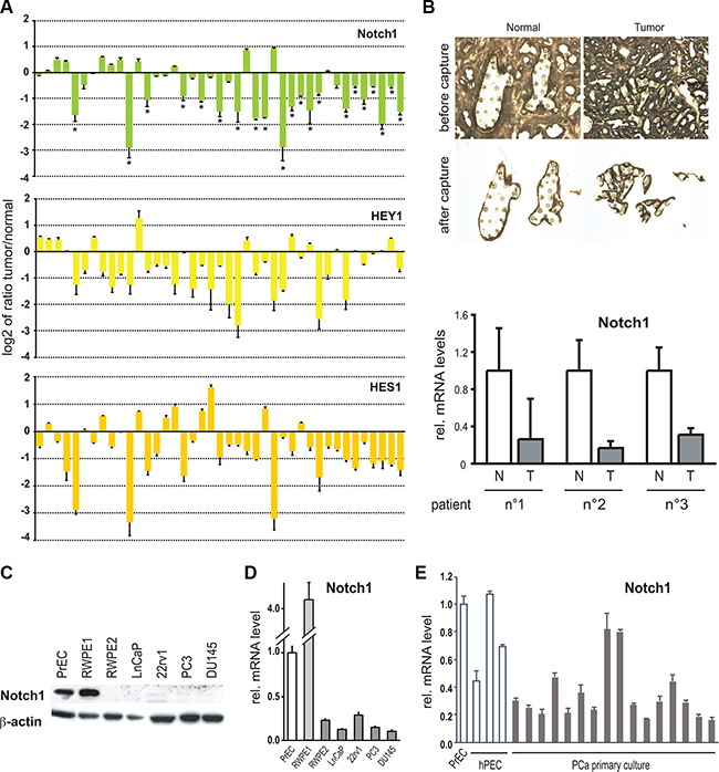 Figure 1: Notch1 expression and activity are down-modulated in human prostate tumors and cancer cells lines. (A) Total RNA from 41 surgically excised prostate carcinomas were analyzed in parallel with 10 normal prostates and/or a commercially available pool of RNA extracted from organ donor healthy prostates for levels of Notch1, HEY1 and HES1 mRNA expression by real time RT-PCR. Results are expressed as log2 ratios of mRNA levels in the individual tumors versus the averaged values of normal prostate samples (using for each samples β-actin for internal normalization). Differences in gene expression below –0.5 are all statistically significant, as calculated by two sample unpaired Student t-test. (B) LCM-obtained epithelial cells from prostate tumor (T, n = 3) and normal prostate tissue (N, n= 3) samples from different individuals were analyzed by RT–qPCR for the Notch1 gene. (C) Human primary prostate epithelial cells (PrEC), immortalized prostate epithelial cells (RWPE1), a ras-induced tumorigenic derivative of RWPE1 cells (RWPE2; [38]), and the indicated prostate cancer cell lines (LnCaP, 22rv1, PC3 and DU145) were analyzed by immunoblotting for the Notch1 protein with β-actin as equal loading control. (D and E) The same set of cell lines as in the previous panel as well as other human primary prostate epithelial cells (hPEC) and immortalized prostate epithelial cancer cells (C1 IM to C45 IM) were analyzed for levels of Notch1 mRNA by real time RT-qPCR. Values are in relative arbitrary units after 18s or β-actin normalization.