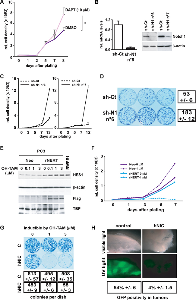 Figure 3: Inhibition of Notch1 expression in normal prostate epithelial cells enhances cell growth whereas activated Notch1 expression in prostate cancer cells inhibits growth and tumorigenesis. (A) Immortalized prostate epithelial cells (RWPE1) were incubated with the γ-secretase inhibitor DAPT at 10 μM or with DMSO at day 0 and cell proliferation was assayed everyday by Alamar Blue assay until day 8. *p < 0.05 (paired student t-test). (B) RWPE1 cells were stably infected with a retrovirus expressing an shRNA against Notch1 (sh-N1 n°6 and n°7) or empty vector control (sh-Ct). Notch1 mRNA and protein levels were determined by real time RT-qPCR (with 36β4 mRNA for normalization) and immuno-blotting. (C and D) The same stably infected RWPE1 cells were examined for their proliferation potential using the Alamar Blue growth/density assay (plating 200 cells per well of a 96 well plate in triplicate) (C) or clonogenicity (plating 2000 cells per 6 cm plate in triplicate; staining of dishes 13 days after plating) (D). (E) Prostate cancer cells (PC3) were stably infected with a retroviral vector expressing a flag tagged-activated Notch1 protein fused to the human estrogen receptor (rNERT), or empty vector control (Neo). Cells were subsequently treated with 4-hydroxytamoxifen (OH-TAM) at the indicated concentrations and collected 3 days later. Nuclear extracts were analyzed by immunoblotting with anti-flag antibodies for detection of the rNERT protein, which is not recognized by antibodies against endogenous Notch1. Immuno-blotting for TBP was used for equal loading control. Total extracts of the same cells were analyzed by immunoblotting for HES1 protein levels, in parallel with RWPE1 cells, using β-actin as equal loading control. (F and G) Proliferation of the same PC3 cells as in the previous panels was assessed by Alamar Blue growth (F) or clonogenicity (G) assays plus/minus treatment with OH-TAM at the indicated concentrations. Numbers of colonies represent the average of triplicate dishes. (H) PC3 cells were infected with retroviruses expressing the activated Notch1 together with GFP or GFP alone as control, mixed with uninfected PC3 cells in a ratio 1:3 and injected subcutaneously (in matrigel; 106 cells per injection) into nude mice. Four weeks later, tumors were dissected, sectioned and visualized directly by phase contrast and fluorescent microscopy under a dissecting microscope. Quantification of GFP positive areas was obtained using the ImageJ software (http://rsb.info.nih.gov/ij) for digitally acquired images of 3 different tumors for each combination of cells. Values are expressed as average percentage area of GFP positivity versus total tumor area.
