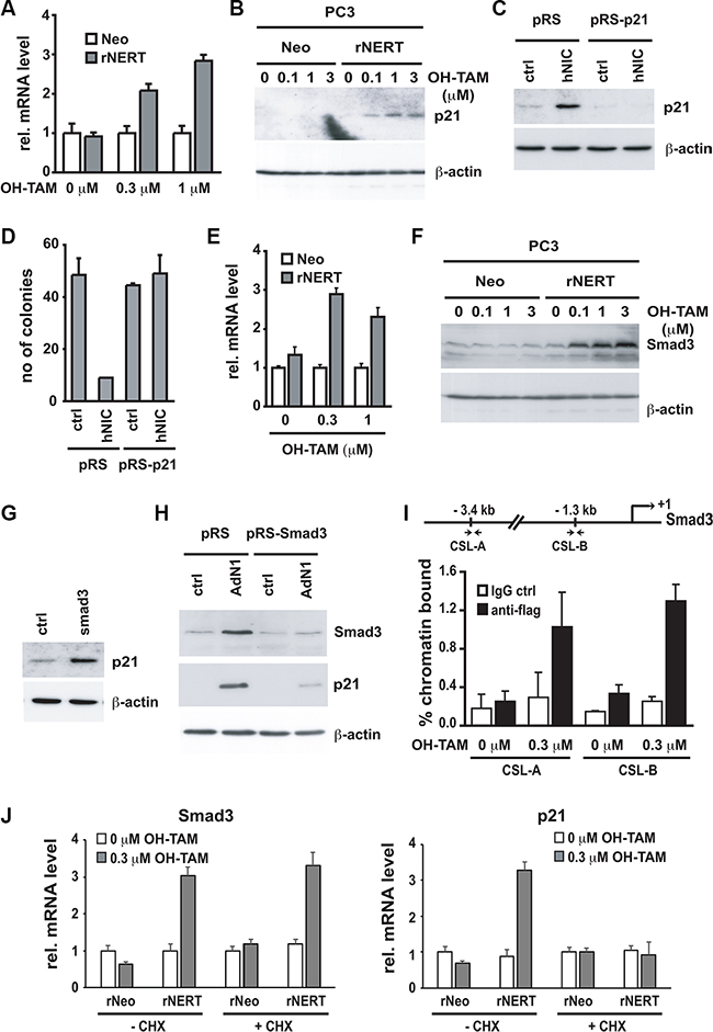 Figure 4: p21WAF1/Cip1 mediates Notch1-induced growth arrest and is controlled by Notch1 through a Smad3 dependent mechanism. (A and B) PC3 cells stably infected with a retroviral vector expressing the flag tagged-activated Notch1 protein fused to the human estrogen receptor (rNERT), or control virus (Neo) were treated for 3 days with 4-hydroxytamoxifen at the indicated concentrations. Expression of p21WAF1/Cip1 was analyzed by real time RT-PCR (using 36β4 mRNA for normalization) (A) and by immuno-blotting (B). (C) PC3 cells were stably infected with a retrovirus expressing an shRNA against p21WAF1/Cip1 (pRS-p21 n°1) or empty vector control (pRS). Cells were subsequently transfected with an expression vector for activated Notch1 (hNIC) together with a neomycin resistance gene, or empty vector control (ctrl). Twenty four hours later, cells were analyzed by immuno-blotting for p21WAF1/Cip1 expression, with β-actin for normalization. (D) PC3 cells plus/minus p21WAF1/Cip1 knock-down and activated Notch1 expression as in the previous panel were replated (at 8 hours after transfection) at low density in triplicate dishes (1000 cells per 6 cm dish) in the presence of neomycin for selection of transfected cells. Numbers of colonies per dish were counted 10 days later. (E and F) The same PC3 cells with inducible Notch1 activity as in (A and B) were analyzed for Smad3 expression by real time RT-PCR (using 36β4 mRNA for normalization) (E) and immunoblotting (F). (G) PC3 cells were transiently transfected with an expression vector for Smad3 (Smad3) or empty vector control (ctrl) for 48 hours, followed by immunoblot analysis of p21WAF1/Cip1 and β-actin proteins. (H) PC3 cells were stably infected with a retrovirus expressing shRNA against Smad3 (pRS-Smad3 n°1) or empty vector control (pRS) and subsequently infected with an activated Notch1 expressing adenovirus (AdN1) or GFP-expressing control (ctrl). Twenty four hours later, cells were analyzed by immunoblotting for levels of Smad3 and p21WAF1/Cip1 proteins with β-actin for normalization. (I) The same PC3 cells with inducible Notch1 activity as in (A and B) were processed for chromatin immunoprecipitation with antibodies specific for flag or non-immune IgG control followed by PCR amplification (50 cycles) of various regions of the Smad3 promoter as indicated in the schematic above. The sequences of the two predicted RBP-binding sites (CSL-A and CSL-B) are, respectively, 5′-CTAATGGGAAAATAA-3′ and 5′-GGGGTGGGAGATTCC-3′. Un-precipitated chromatin preparations were similarly analysed and used as “input DNA” control. Binding of the rNERT-flag fusion protein to its two predicted CSL binding sites in the Smad3 promoter was quantified by chromatin immuno-precipitation assay and real time PCR. The amount of precipitated DNA was calculated relative to the total input chromatin, and expressed as percentage of the total according to the following formula (Frank et al. 2001) : % total = 2ΔCtx5 where ΔCt = Ct (input)-Ct (immuno-precipitation). Ct: cycle threshold. (J) PC3 cells expressing the rNERT fusion protein were treated, in parallel with control cells (Neo), for 24 hours with 4-hydroxytamoxifen in presence or absence of cycloheximide (CHX, 10 mg/ml, added 2 hours before 4-hydroxytamoxifen treatment). Expression of Smad3 (left panel) and p21WAF1/Cip1 (right panel) was analyzed by real time RT-PCR (using 36β4 mRNA for normalization).