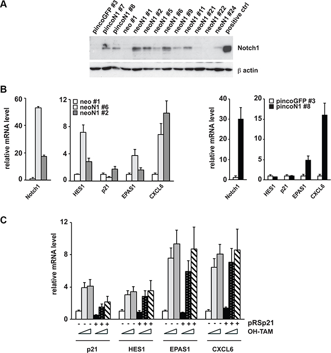 To better investigate the growth suppressing effects of Notch1 in prostate cancer cells expressing low levels of this gene, we looked for well-established tumor suppressors among the genes induced by Notch1 in PC3 cells. As shown in Table 1, tumor suppressor p21WAF1/CIP1 contributes to the overrepresentation of “regulation of progression through the cell cycle in prostatic neoplasms” within the list of genes up-regulated by Notch1. A number of studies have shown that expression of p21WAF1/CIP1 is reduced in human prostate cancer [41, 42]. Its expression strongly increases upon Notch1 upregulation (FC = 3.3 and adjusted p-value = 0.0003 in PC3 cells by microarray data, Supplementary Table 1). Expression of activated Notch1 (via a construct encoding Notch1-ER fusion protein) in PC3 cells followed by RT-qPCR analysis confirmed a significant increase of p21WAF1/CIP1 levels already at low levels of activated Notch1, sufficient for growth suppression (Figure 4A, 4B). To assess the functional significance of these findings, PC3 cells were infected with retroviruses expressing two different shRNAs against p21WAF1/CIP1 in parallel with an empty vector control (pRS) (Figure 4C). Cells were subsequently transfected with a plasmid expressing activated Notch1 together with a selectable marker. Activated Notch1 expression caused significant growth suppression, as assessed by colony formation, of control cells but not of PC3 cells with p21WAF1/CIP1 knock-down (Figure 4D).