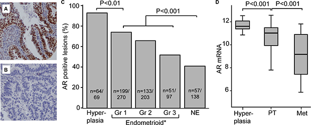 AR is expressed in the majority of hyperplasias and primary endometrial cancer lesions
