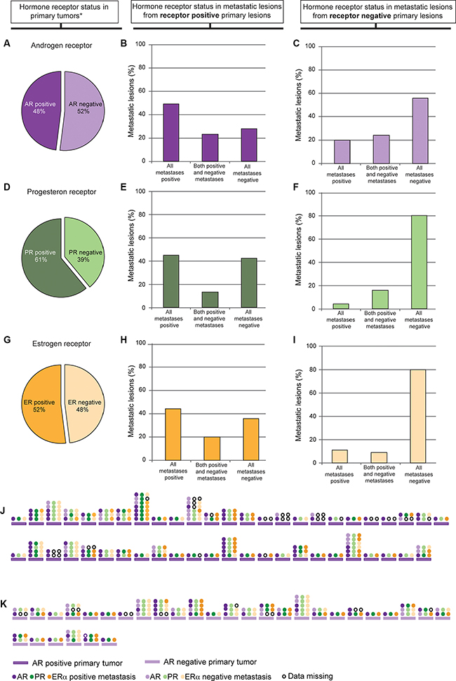 Figure 2: Expression of the individual hormone receptors AR, PR and ERα in metastatic lesions based on its expression in primary tumor. 48% of the primary tumors with corresponding metastatic lesions were AR positive (IHC score 1–9) (A). Graphs show distribution of AR expression in the metastatic lesions from AR positive primary tumors (B) and AR negative primary tumors (C). 61% of the primary tumors with corresponding metastatic lesions were PR positive (IHC score 1–9) (D). Graphs show distribution of PR expression in the metastatic lesions from the PR positive primary tumors (E) and PR negative primary tumors (F). 52% of the primary tumors with corresponding metastatic lesions were ER positive (IHC score 4–9) (G). Graphs show distribution of ER expression in the ER positive primary tumors (H) and ER negative primary tumors (I). Expression patterns in individual metastases from AR positive patients (J) and AR negative patients (K) are shown as AR (purple), PR (green) and ERα (orange) in J and K. One line of circles represents one metastasis, and shows the difference in hormone receptor expression in that specific metastasis. Only patients with one or more AR positive metastases are shown. *Only primary tumors with corresponding metastases included.