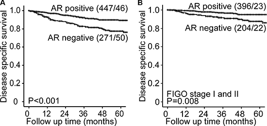 Data were analyzed using SPSS version 22 (SPSS Inc, Chicago, IL). Probability < 0.05 was considered statistical significant. Associations between groups were evaluated using the chi-square test for categorical variables and the Mann-Whitney U test for continuous variables. Univariate survival analysis was performed using the Kaplan Meier (product-limit) method. Date of primary surgery was entry date, and date of death due to endometrial carcinoma was defined as event for estimation of disease specific survival. Survival between groups was compared using the log-rank (Mantel-Cox) test. The Cox proportional hazard regression model was used to evaluate the prognostic impact of AR adjusted for other prognostic parameters. Included in the model was in addition to AR; age, histologic type and grade, all factors with known prognostic impact in endometrial cancer.