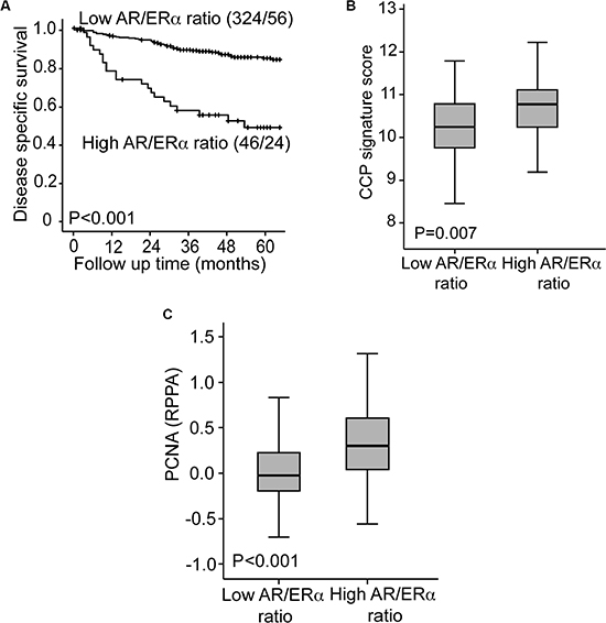 Figure 4: High AR to ER ratio identifies a subgroup with particularly poor survival. Patients with a high AR to ERα ratio assessed by Reverse Phase Protein Array demonstrate a particularly poor disease specific survival compared to patients with a low AR to ERα ratio (A). The group with high AR to ERα ratio had significantly higher CCP score (B) and PCNA expression (C) compared to the group with low AR to ERα ratio.