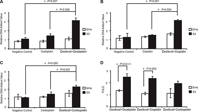 Figure 1: Desferal synergistically interacts with platinum drugs and increases platinum–DNA adduct formation in oxaliplatin-resistant S3 cells. (A–D) Measurement of platinum–DNA adduct formation in cells treated with 1-fold of IC50 of platinum drugs (refer to Table 1) and desferal, as described in the Materials and Methods section. Each value is presented as the mean ± standard deviation (SD) of three independent experiments (P < 0.05).