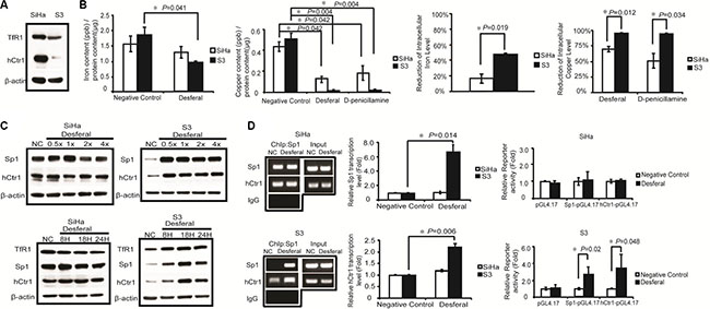 To determine the basal level of both hCtr1 and TfR1 proteins in SiHa and S3 cells, western blot analysis was performed. The results revealed that the expression level of hCtr1 and TfR1 was higher in SiHa cells than in S3 cells (Figure 2A). Furthermore, we examined the effect of desferal on intracellular iron and copper concentrations in both SiHa and S3 cells. As presented in Figure 2B, desferal treatment significantly reduced more intracellular iron and copper concentrations in S3 cells than in SiHa cells (48% vs.17%, P = 0.019; 96% vs.69%, P = 0.012). Previously, we demonstrated that the expression of hCtr1 is controlled by the transcription factor Sp1, which is negatively regulated by intracellular copper concentrations [14]. We further evaluated the effect of desferal on the expression of Sp1 and hCtr1 in both SiHa and S3 cells. We observed an increase in the expression of Sp1 and hCtr1 in the concentration- and time-dependent manner in S3 cells; however, desferal did not affect Sp1 and hCtr1 in SiHa cells (Figure 2C). Notably, desferal increased the expression of TfR1 in a time-dependent manner (Figure 2C). We further investigated whether the expression of hCtr1 is through the transcriptional regulation of Sp1 on the hCtr1 promoter in S3 cells. We observed that desferal treatment induced the binding of Sp1 to the hCtr1 promoter and increased the expression of hCtr1 (Figure 2D).