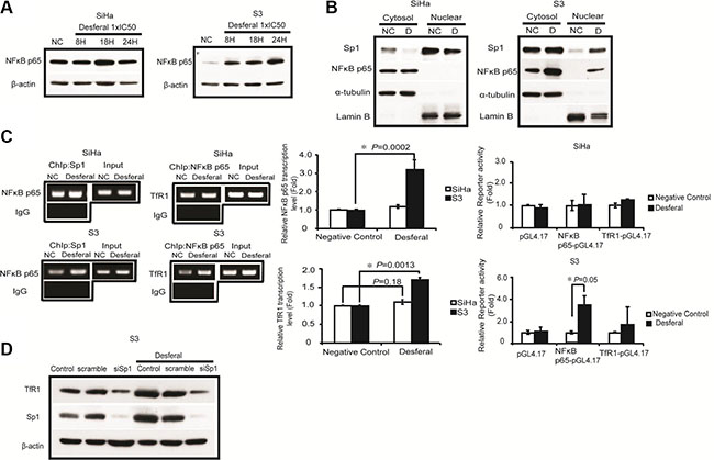 Figure 3: Desferal induced the expression level of TfR1 through the Sp1 -dependent pathway. (A) Desferal induced NF-κB p65 expression in S3 cells in a time-dependent manner. Both SiHa and S3 cells were treated with desferal for 8, 18, and 24 h. Cells were then harvested and subjected to Western blot analysis. NC denotes negative control (B) The effect of desferal on the nuclear localization of Sp1 and NF-κB p65. Cells were treated with or without desferal for 24 h, and the cytosolic and nuclear fractions were then separated, as described in the Materials and Methods section. (C) Desferal induces the binding of Sp1 to the NF-κB p65 promoter region and that of NF-κB p65 to the TfR1 promoter region in S3 cells as demonstrated using a ChIP assay. Cells without desferal treatment served as the negative control (NC). Desferal significantly induced the transcription of NF-κB p65 and TfR1 in S3 cells as demonstrated using an RT-qPCR assay. The effect of desferal on the promoter activity levels of both NF-κB p65 and TfR1 promoters was determined using promoter assay (P < 0.05). (D) Desferal induced TfR1 expression through the Sp1-dependent pathway. S3 cells were transfected with either scramble control or Sp1-targeted siRNA, respectively, followed by treatment with desferal. Cells without transfection served as the control. β-actin was used as an internal control.