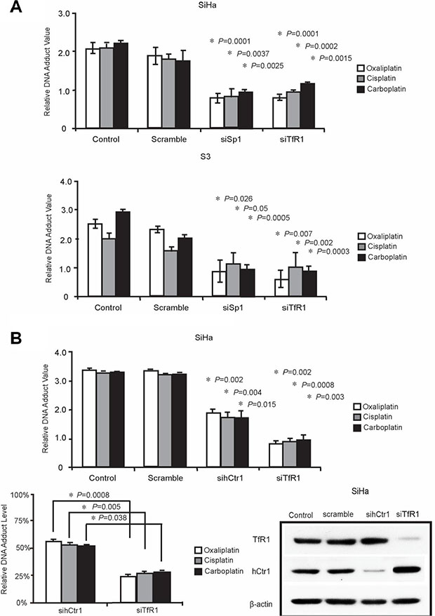 Figure 4: TfR1 promoted DNA adduct formation through Sp1. (A) Sp1 or TfR1-targeted were transfected into SiHa and S3 cells, respectively. 5-fold of IC50 platinum drugs including oxaliplatin, cisplatin, and carboplatin were incubated with cells for performing ELISA assay (P < 0.05), as described in Materials and Methods section. (B) SiHa cells were transfected with TfR1- or hCtr1-targeted siRNA for comparing the efficiency of transporting platinum drugs for performing ELISA assay (P < 0.05).